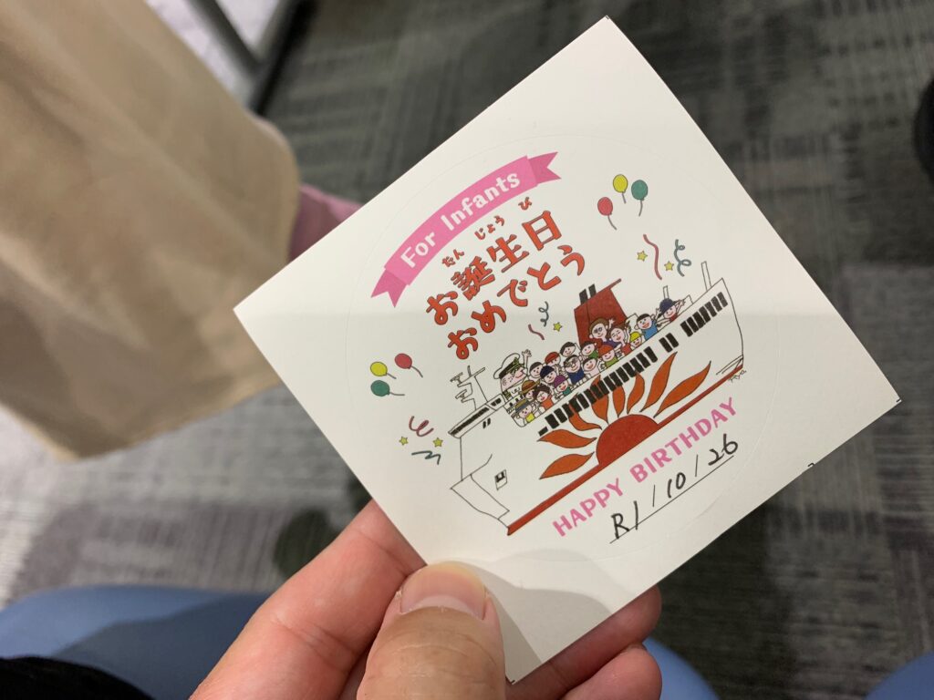 ③港窓口でバースデーシールをもらい、乗船後夕食チケットをもらう